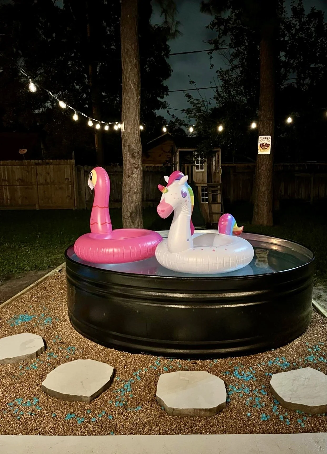 An 8 or 10 foot diameter, 2 feet deep, circular Hastings Poly tank inside a galvanized steel stock tank.